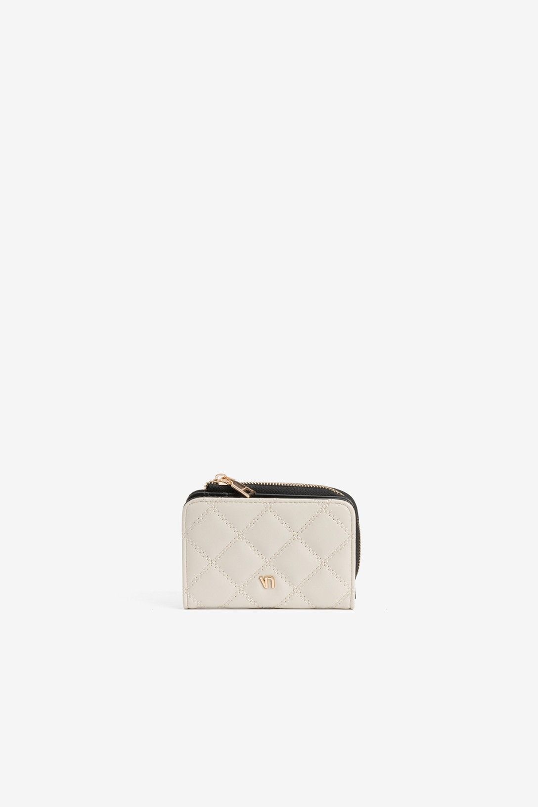 Elegante porta monedas beige con diseño acolchado, cierre de cremallera y compartimentos interiores.