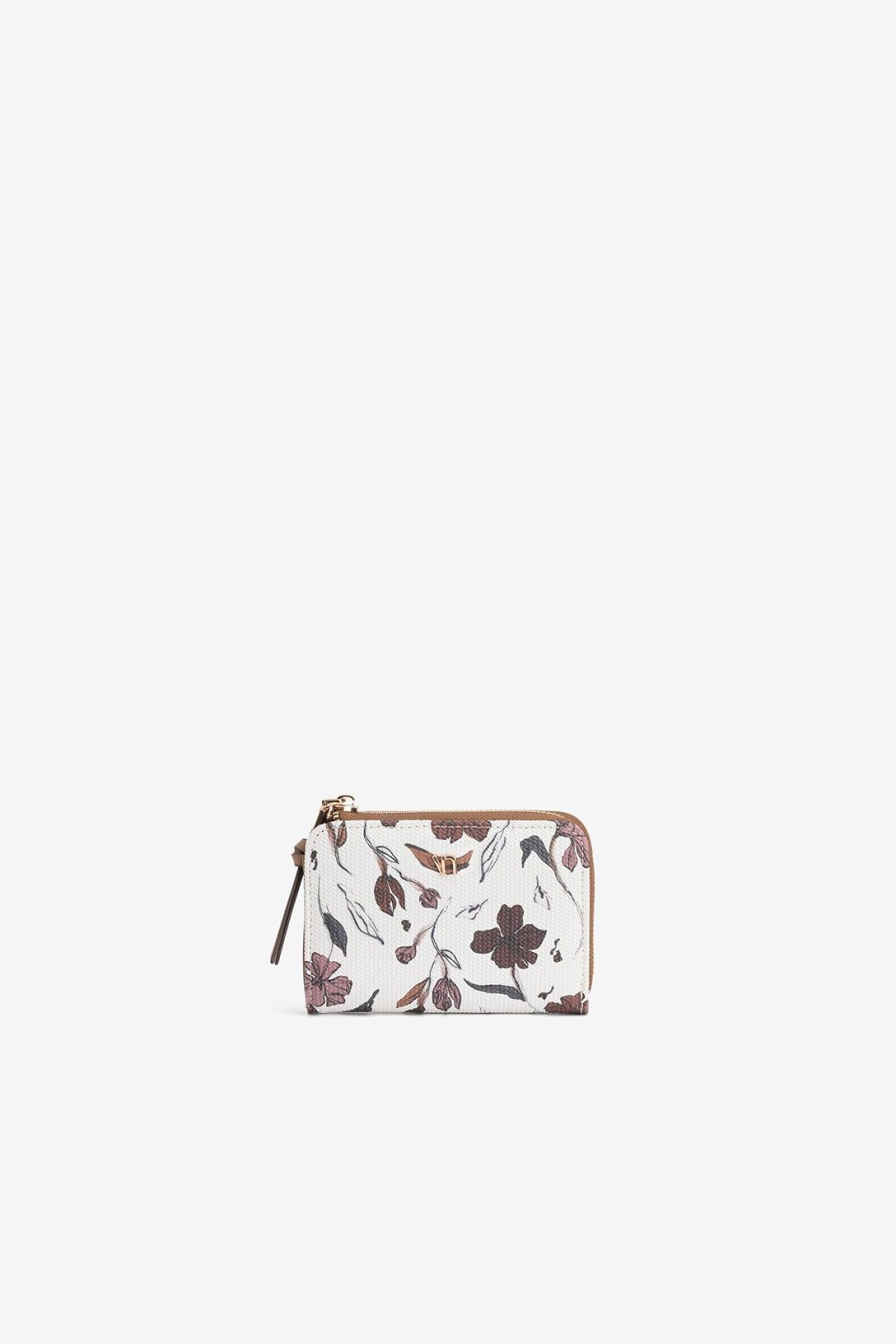 Monedero compacto con estampado floral en tonos marrones y cremallera dorada. Interior espacioso y organizado.