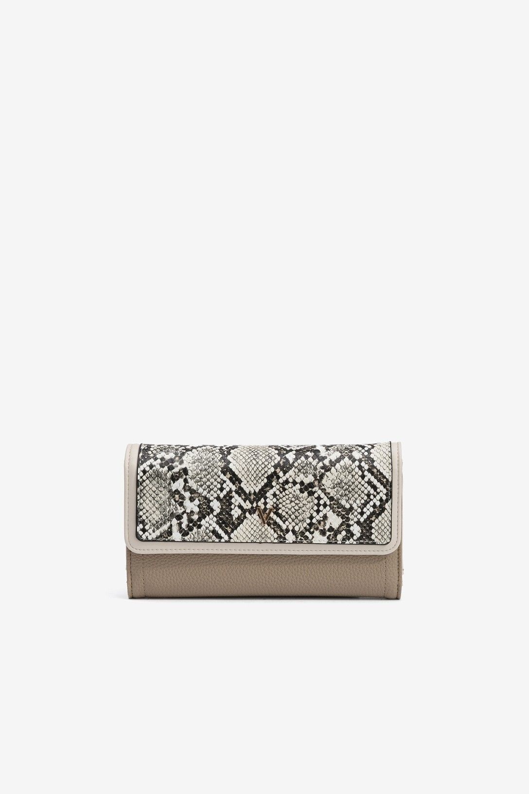 Monedero en efecto piel bicolor, con solapa efecto serpiente y cierre magnético. Compartimentos y bolsillos interiores para billetes, tarjetas y monedas. Tamaño grande. Dimensiones: 20 x 11 x 5 cm