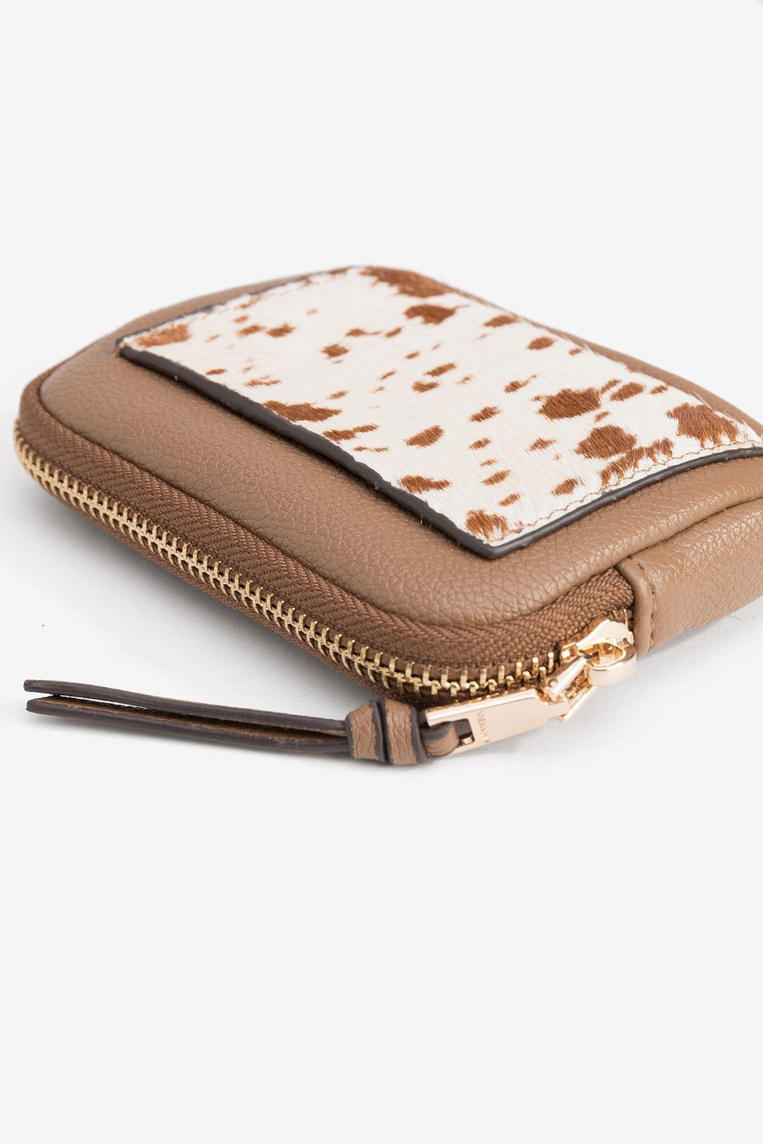 Porta monedas marrón con estampado animal, cierre de cremallera dorada y detalle de asa lateral.