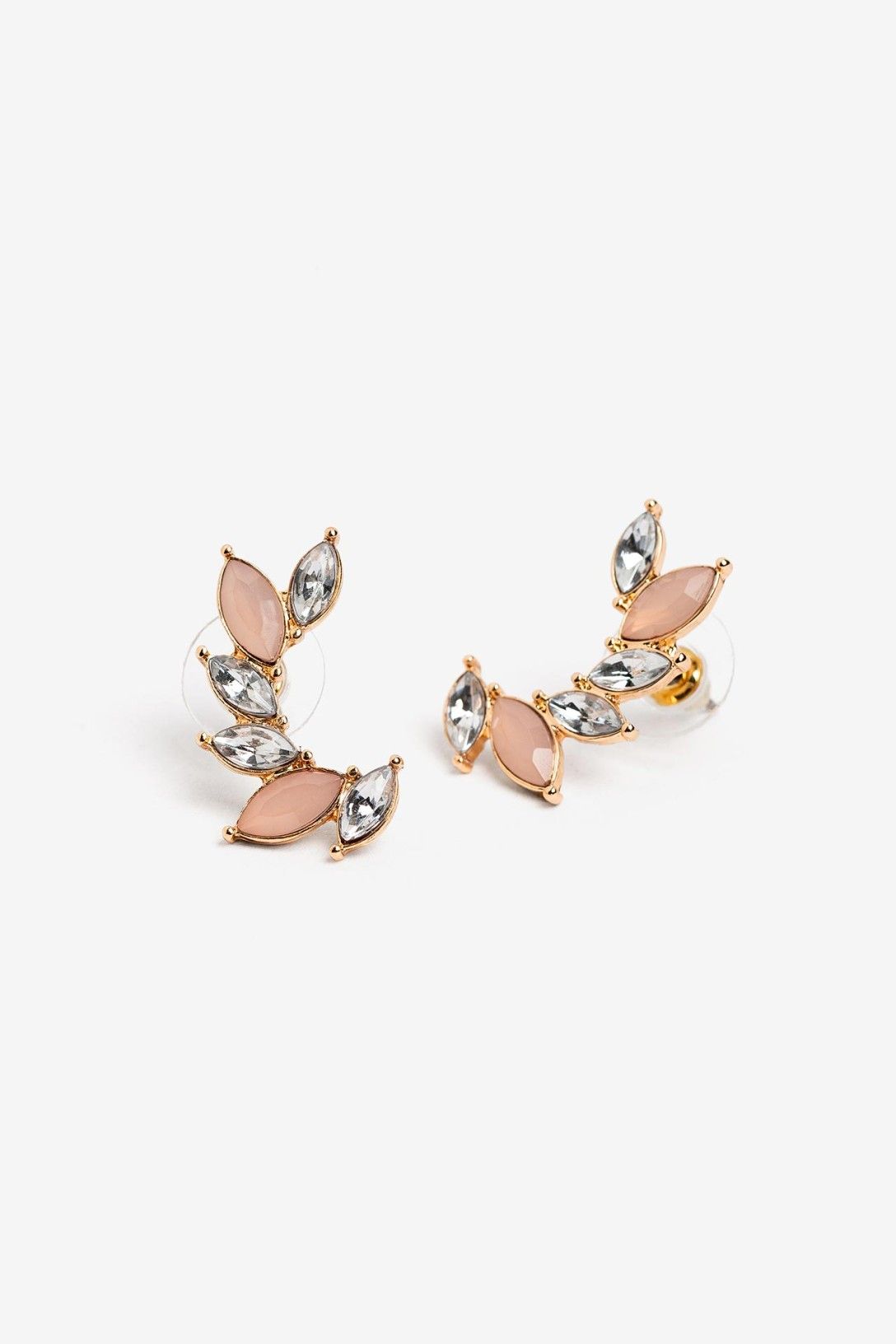 Pendientes metálicos curvos, con pedrería y diseño de hoja. Cierre con tope. Tamaño pequeño.