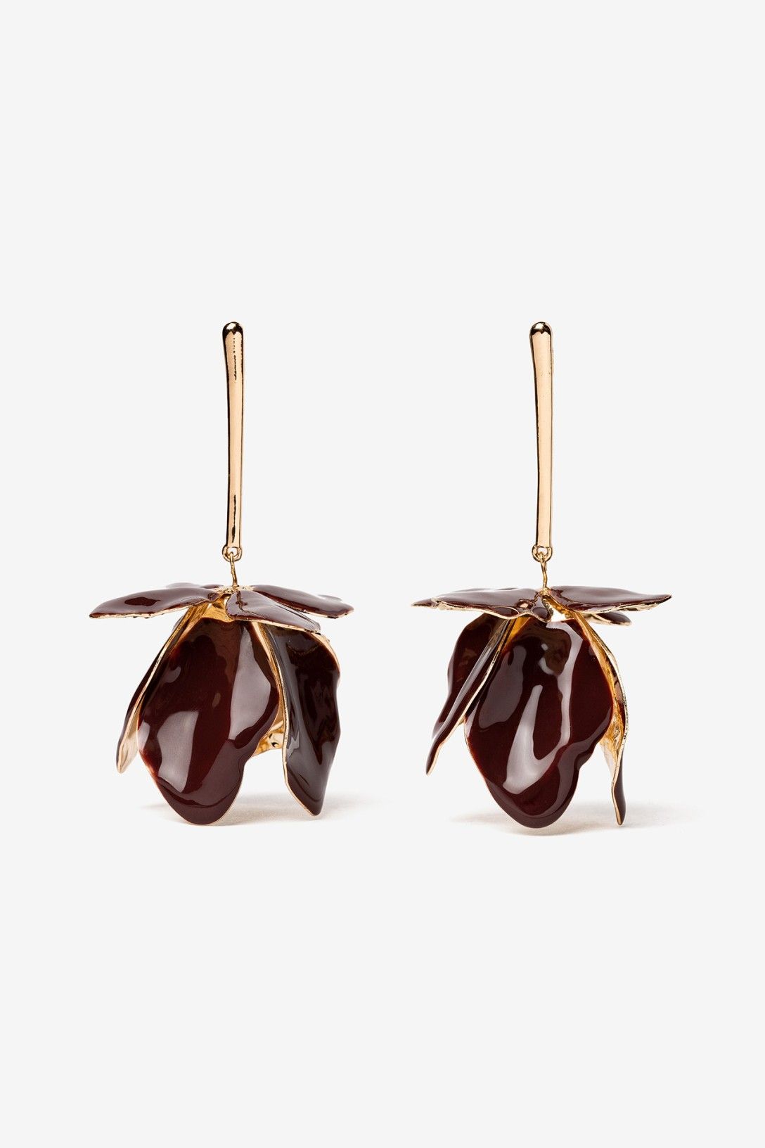 Pendientes colgantes dorados con diseño floral y pétalos en tono marrón oscuro.