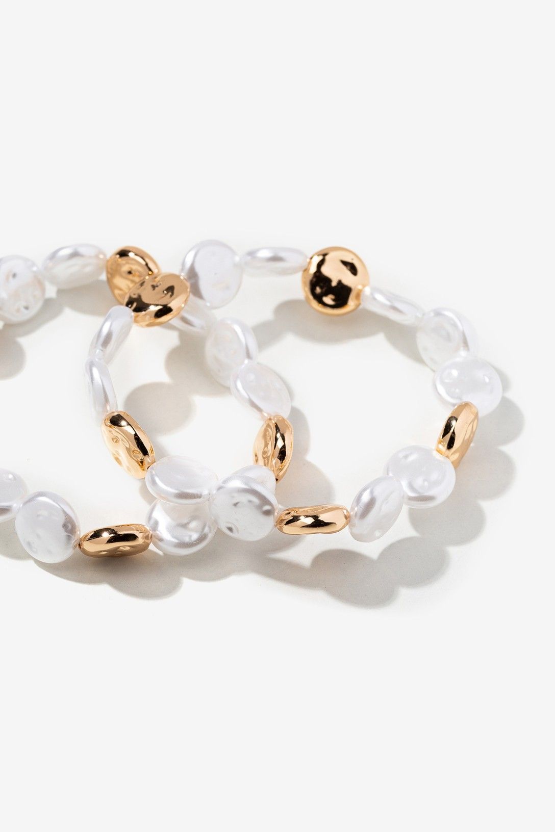 Pack de dos pulseras con cuentas de efecto perla y metálicas. Interior elástico.