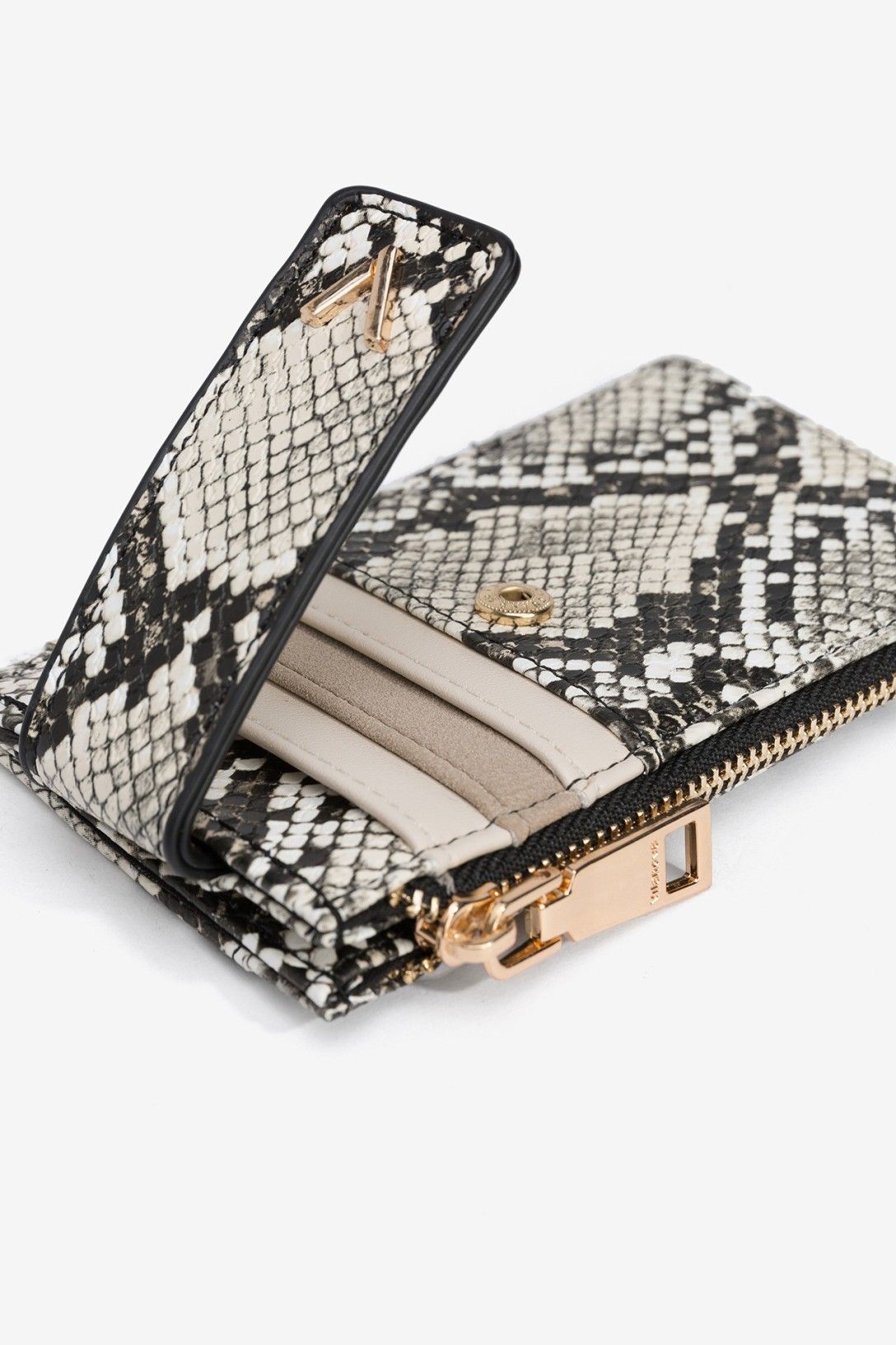 Tarjetero en efecto piel de serpiente, con cinco compartimentos, solapa y cierre lateral de cremallera. Tamaño pequeño. Dimensiones: 7 x 13 x 1 cm